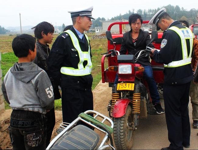 11月3日,为保障集镇交通秩序,小海镇开展摩托车和三轮车超载、非法营运专项整治活动,对严重影响交通秩序的机动车辆给予警告,对非法营运的车辆给予处罚。图为交警在检查过往摩托车和三轮车。(记者 胡雍辉 摄)