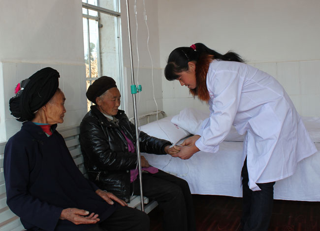 近年来,我县把农村医疗卫生工作作为一项重要民生工程来抓,全县623个行政村全部设立了卫生室,农村公共医疗卫生服务水平不断提高,地方病、传染病防治成效明显,基本实现了“大病不出乡,小病不出村”。图为近日小海镇朱嘎村村卫生室医务人员正在给病人输液。 (记者 王颖 摄)