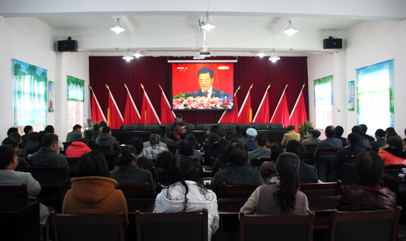 11月8日9时开始,威宁认真组织各级各部门、各乡镇、村(社区)、企业、中小学、社会各界党员及干部群众集中收看中国共产党第十八次全国代表大会实况直播。图为草海镇城东社区群众在观看开幕直播。(本报记者 何 欢 摄)