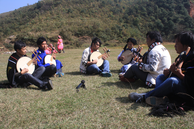 十八大期间,热情好客,能歌善舞的板底乡彝族人民在海草花场席地而坐,弹起美妙的月琴,表达对祖国的真心祝愿。图为彝族群众在表演月琴弹奏。 (本报记者 龙胜 摄)