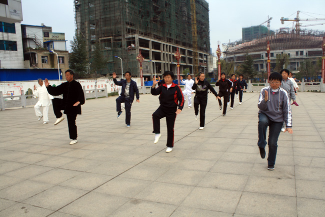 “参与全民健身,乐享低碳生活”。我县会展中心广场是老百姓健身锻炼的好场所。近日,记者发现,不光是通常的舞蹈健身,连太极拳也被搬上了锻炼身体的舞台。居民们自发组织起来,每天清晨,会展中心广场上总少不了他们的矫健灵动的身影。 (本报记者 龙胜 摄)