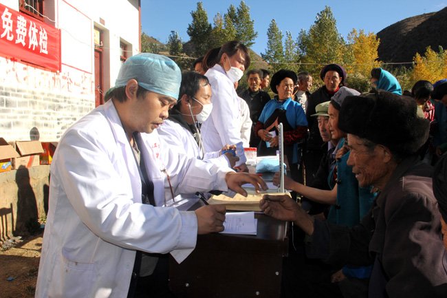 活动还就老年痴呆症的预防与日常保健、高血压、高血脂以及冠心病等病症的预防与日常保健、病人的饮食调理等知识进行宣传,为老人和妇女儿童发放保健、常见慢性病及传染病防治手册200余份,近1200多农村老年人接受免费检查。图为医务人员正在为老年人检查身体。