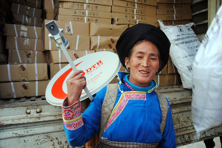 据了解,威宁15000套“村村通”卫星广播电视接收设备将在近期陆续发放到各乡镇,并全部完成培训、安装、收看等全部内容。在有效帮助当地村民学习和了解中国共产党第十八次全国代表大会精神落实情况的同时,让全县农户的收视质量大幅度提高;群众可以及时掌握各种农业信息,提高农业科技水平,推进文化建设进度。图为龙场镇领到村村通接收机的群众开心地笑了。