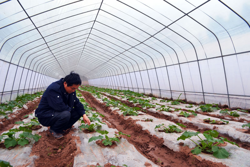 ▲金钟镇夸都村特色农业产业合作社,利用特殊的地理环境和独特的小区气候,投资20余万元建成35个大棚种植辣椒、西红柿、茄子等,示范带动当地农民增收致富。图为技术人员正在大棚里查看蔬菜长势。(通讯员 王元勋 摄)