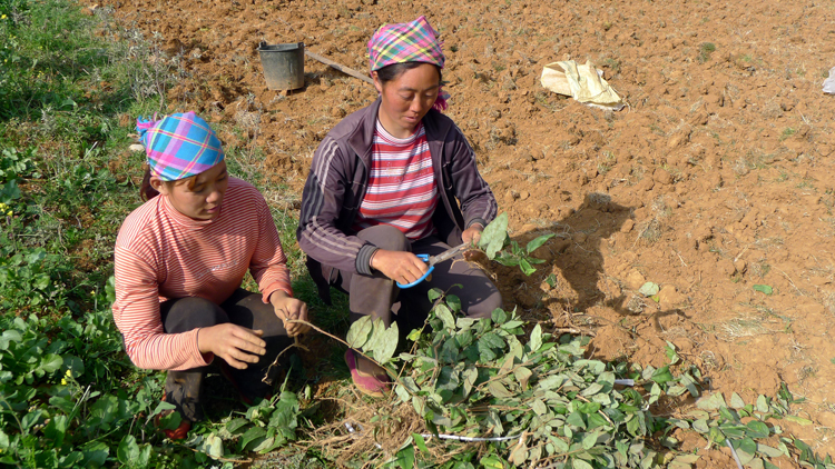 ▲由省人口福利基金会申请“人口福利·生育关怀基金”30万元,岔河乡计生户自筹资金30万元建设的金银花基地即将进入苗期移栽。图为计生户正在修剪金银花苗。(通讯员 李华 摄)