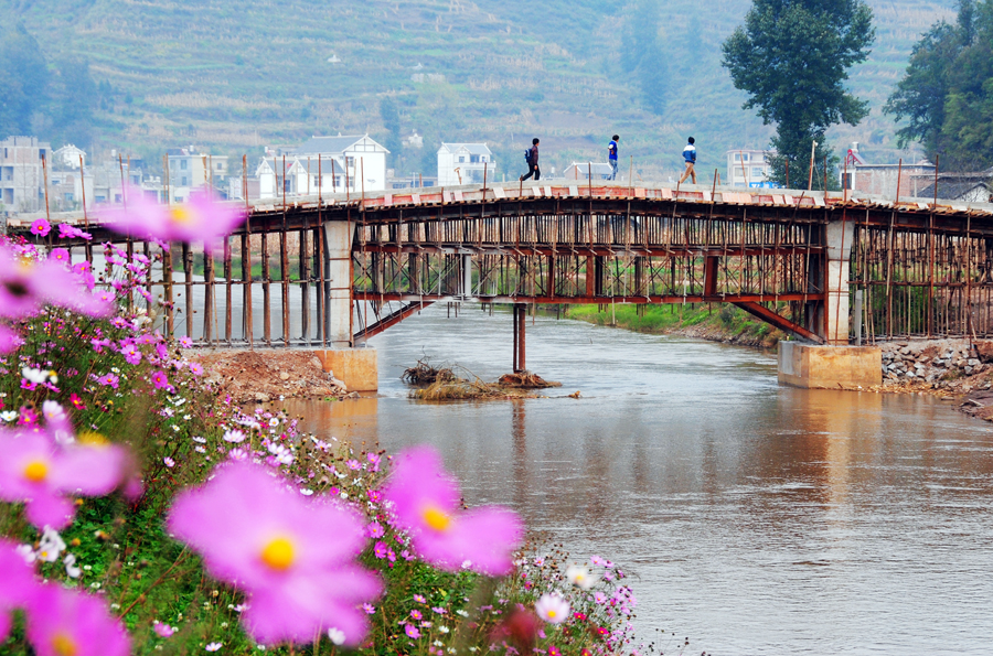 ▲目前,东风镇特色小城镇建设已经进入收尾阶段。小集镇里的房屋、凉亭、广场、景观桥已初具雏形。今年底,一座“小桥流水人家”诗意般的小镇即将展现在世人面前。图为正在加紧施工中的景观桥。(记者 杨文斌 摄)