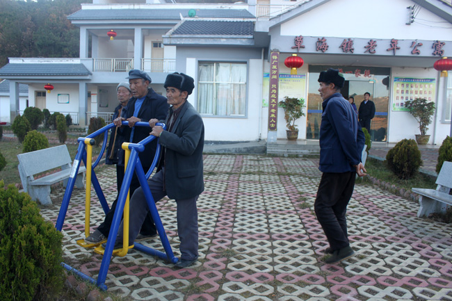 11月27日,记者在草海镇老年公寓看到,公寓内干净、整洁、温馨、和睦,相关的健身器材、办公用品、生活日用品等配套设施应有尽有。据了解,该镇老年公寓于2010年建成,目前有30多名老年人入住。图为老年人正在锻炼身体。 (记者 胡雍辉 摄)