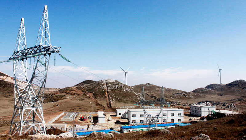 ▲日前,记者在平均海拔2300米的百草坪看到,华能乌江源百草坪风电工程220千伏升压站建设工地上,工程建设人员正在忙着调试机组。该升压站预计于3月中旬开机发电并正式投产,以1回220千伏出线接入威宁变电站,最后送入贵州电网。整个百草坪风电场项目全部建成投产后,年发电量将达3.7亿度,创税可达4000万元。图为升压站建设场景。