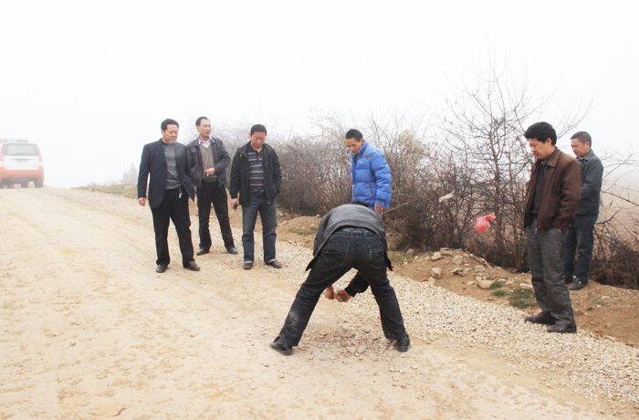 ▲3月8日,县交通运输局对雪山朱家院子至叫顶山、兔街至大街、大街至羊街几条通村油路进行质量督查。本次督查主要采取抽点检测公路填隙层和级配层技术尺寸是否符合设计要求、材料是否符合技术标准,凡不符合设计标准的工程一律重新修建。图为督查组在抽点检查。