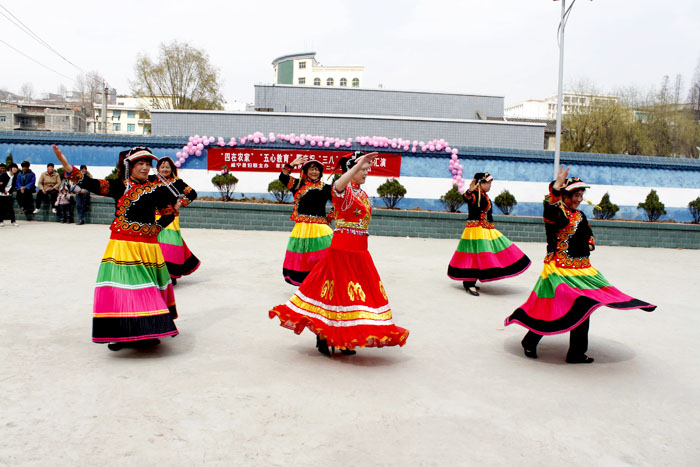 ▲3月8日,草海镇富民村老年文艺队,在草海码头旁花鸟市场门口,举行“三八”国际劳动妇女节文艺演出,县妇联、草海镇等相关部门参加。图为文艺演出现场。