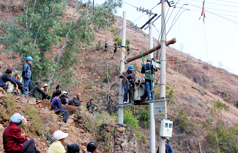 刚到任几个月的玉龙服务站站长刘仕全,在近期的一次抄表工作中了解到这个情况后,及时向迤那供电所和供电局作了汇报。供电局得知新田组210户群众因为用水问题导致生产生活得不到保证,便召开了专题会议,紧急安排生产技术部到现场勘查,在第一时间拿出了解决方案后,安排迤那供电所及时办理业扩流程。3月2日,迤那供电所及时组织了由供电所、新田组村民共同组成36人的安装队,于当日在新田组开始安装变压器。现场45度左右的碎土斜坡单人上去都费力,更不用说抬着100KVA的变压器、横担上山了。一时间,光秃秃的山上因为有了这台变压器而变得热闹起来,变压器增容成了新田组今年的第一件大事。
