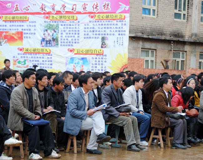 自2010年起,针对我县县情,县委、政府特提出以“五心”教育提素质的大教育战略。结合县情,我县在践行“立国先立人,立人先立德”过程中,把五心教育与素质教育统一结合起来,以校本实践为切入点,在县内部分学校编写校本教材的基础上,统一编写全县中小学《五心教育》地方德育教材,从特级教师、研究员和一线教师中选拔精兵强将组成教材编写组。县委政府拨款80万元,县教育局出资10万元,保证了教材的编写出版。该教材共计17余万字,分为小学、初中、高中各学段一套三册,经贵州省中小学教材审查委员会2011年初审通过,成为全省第一套中小学地方德育教材。图为龙场镇各小学的校长及教师加了《五心教育》地方课程培训。 (杨文斌 摄)