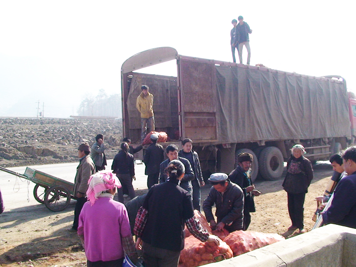 ▲金钟镇冒水村红岩组的土地已种植大白菜多年,为保护耕地,提高效益,今年村民想实行轮作,但苦于无出路。近日,草海农产品农业专业合作社无偿提供120吨优质洋芋种给冒水村红岩、干桥、营脚3个组的村民种植,为村民解了心头的结。图为村民们正在免费领取洋芋种。 (王元勋)