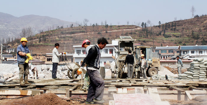 ▲3月14日,记者在东风镇元木村看到,以“农业产业化带动农民增收、工业化带动农业增效、城镇化带动农村发展”为目标,提升乡镇集镇建设品味化,该镇小集镇建设正如火如荼地进行。图为繁忙的施工现场。 (本报记者 张 锋 摄)