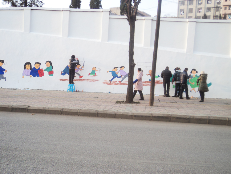 ▲3月13日,记者在原威师大门前看到,草海镇与试验三中、小太阳幼儿园在围墙上作画,以“宣传画”的形式宣传计生工作。图为工作人员正在作宣传画。 (唐民军 摄)
