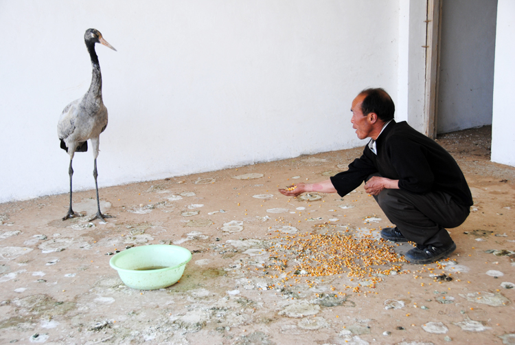据草海管理局统计数据显示,截止3月18日,在草海尚未迁徙的黑颈鹤还有400余只、灰鹤60余只、斑头雁1000只左右,其他鸟类1万多只。随着天气逐日变暖,在即将到来的农历三月初三左右,今年前来草海越冬的候鸟将全部迁往北方气候适宜地,等到今年农历九月九到时,才会重返威宁草海越冬。图为管护员臧尔军在与受伤的黑颈鹤交流、喂食。 (杨文斌)