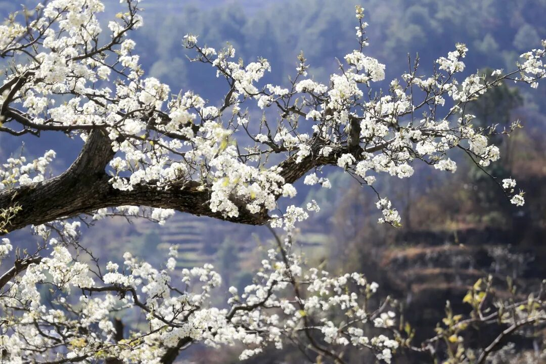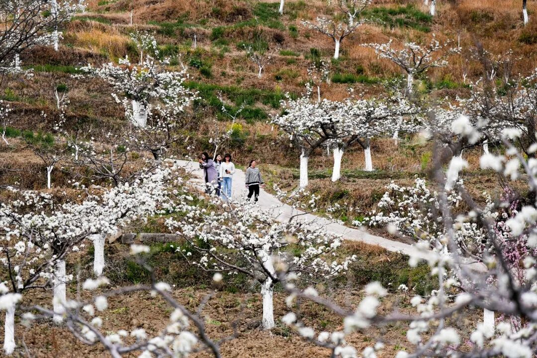 周边游客齐聚梨园,赏花拍照、打卡留影。游客们或驻足拍摄整树繁花,或凑近花蕊捕捉细节,或与家人朋友在花树下合影,欢声笑语不断。