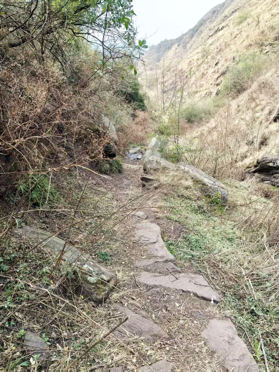 这份心愿,终于在2026年3月5日至7日得以实现。这一天,春寒料峭,乌蒙山的晨雾还未散尽,我与贵州大学研究中国矿业史的老师们一道,组成三人调查小组,带着史料、相机和笔记本,踏上了走访哈喇河所有炼矿遗址的征程。从陈家沟出发,我们循着当年马帮走过的废弃驿道前行。这条驿道,早已被岁月遗忘,长满了荆棘与杂草,锋利的荆棘划破了我们的衣裤,脚下的碎石子硌得人脚步踉跄,每走一步都格外艰难。我们一边拨开荆棘,一边对照史料,辨认着驿道旁的遗迹,偶尔能看到流水带来的矿渣,那是当年矿工们留下的痕迹。