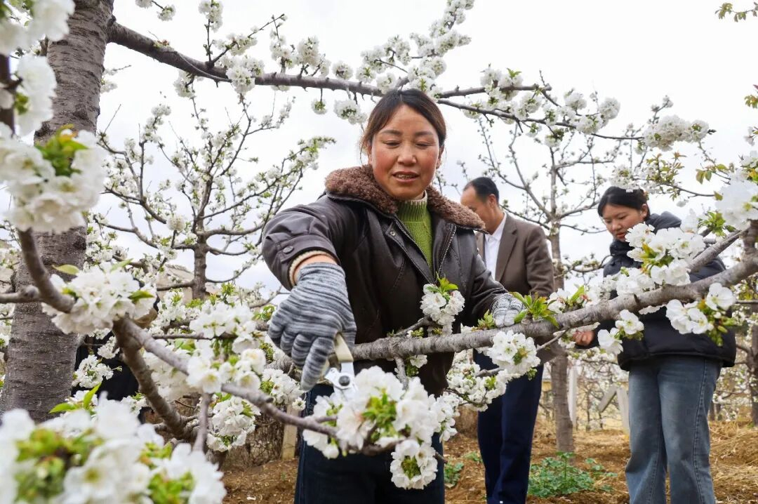 务工群众正在给车厘子疏花