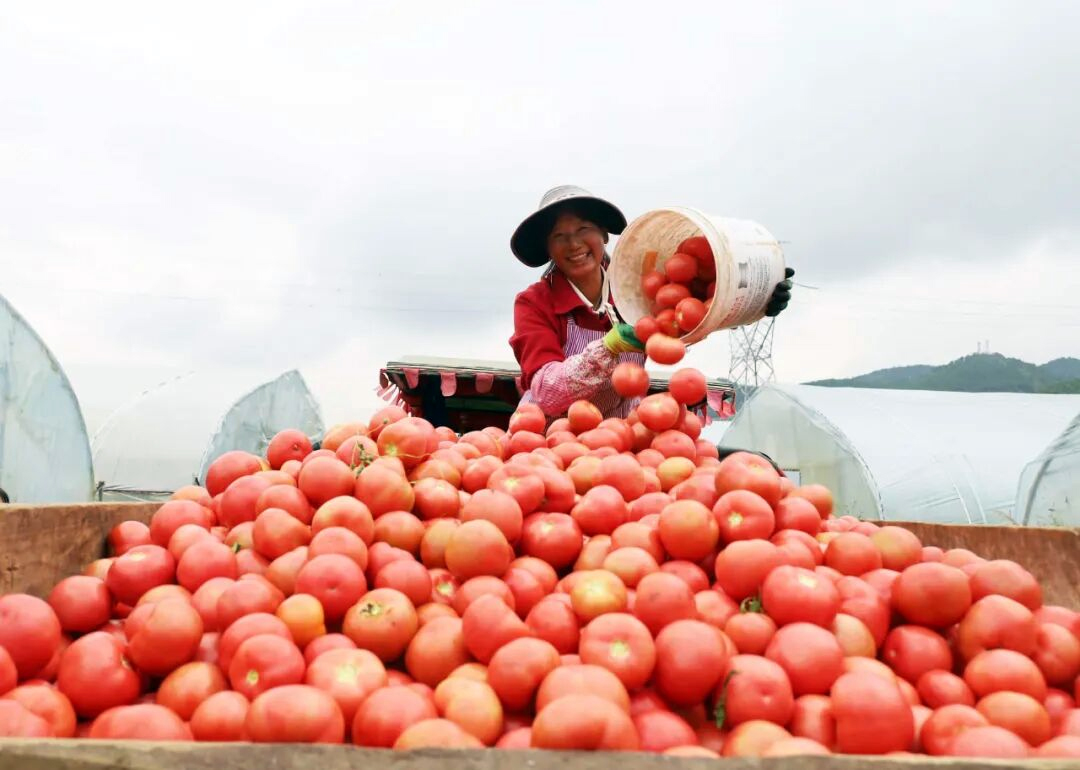 “我们公司2021年就扎根松山村了,当时流转300亩土地建了900多个种植大棚,今年全部种上了西红柿。”?基地负责人范胜福一边查看西红柿长势,一边介绍,“从8月25号开始采摘,能一直采到10月底。今年行情好,每亩能采收西红柿1万斤左右,产值达到2万元。” 在基地的分拣厂房内,刚采摘的新鲜西红柿堆成 “小山”,务工群众围在 “果山” 旁,按照果实品相分类装筐。