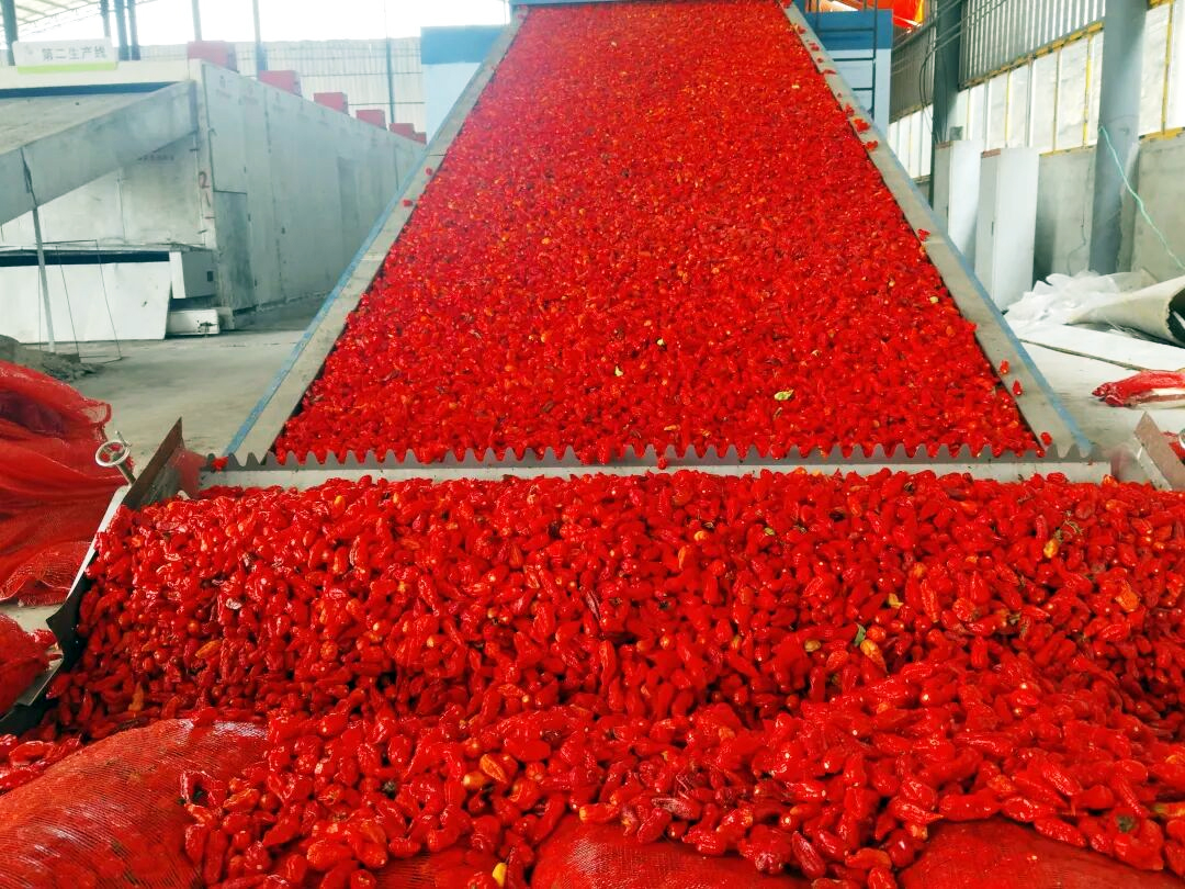 趁着夜幕未完全降临,离工厂近的村民直接把辣椒拉到厂里售卖。一辆辆满载着新鲜工业辣椒的货车往来穿梭,工厂内一片热火朝天。工人师傅们手脚利落地将一筐筐鲜红饱满的工业辣椒从车上卸下,又迅速送上烘干机。厂房内,多条烘干生产线火力全开,辣椒经过分拣、烘干等工序后, 变成色泽鲜亮的干椒,再由工人快速打包、装车。