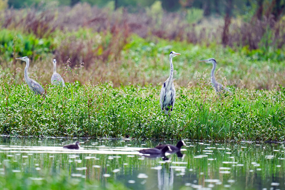 近年来,威宁自治县深入推进湿地保护和修复,草海、锁黄仓湿地公园呈现出一幅人和鸟欢的和谐画面。图为9月21日,在锁黄仓湿地公园,休憩的苍鹭和觅食的野鸭相映成趣。(赵庆能 摄)