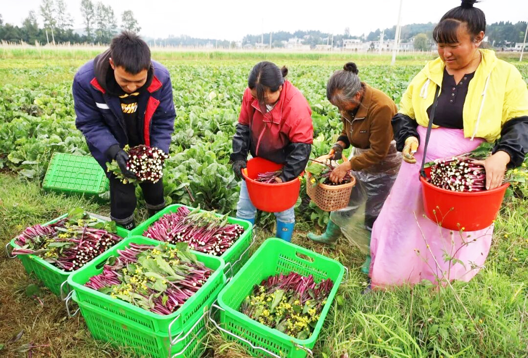 草海镇卯关社区务工群众正在将红菜苔装筐