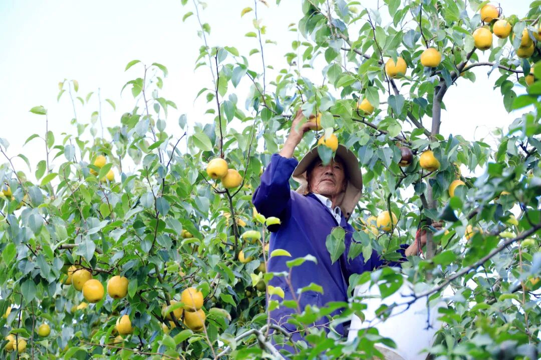 梨树下,务工群众正提着塑料桶穿梭在枝叶间,灵活地将成熟的梨子采下,在另一边的分拣棚里,分拣工人正精心挑选,把采摘下的鲜梨按品相、大小分拣装筐……