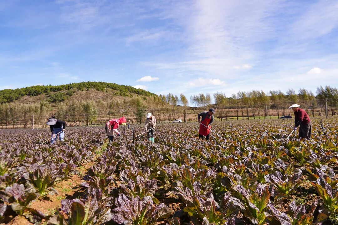 立冬时节,阳光明媚,位于威宁自治县双龙镇水潮社区的贵州省农发集团下属子公司贵州蔬菜集团农业科技发展有限公司双龙基地内绿意盎然,连片的红莴笋迎来了管护的关键期,10多名务工群众手拿锄头穿梭在田垄间进行除草,共同勾勒出一幅“冬闲人不闲、勤劳促振兴”的喜人景象。