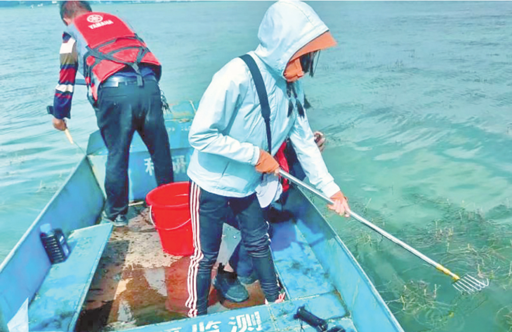 经过两个多小时的暴晒,团队完成水草测量和水质监测工作。