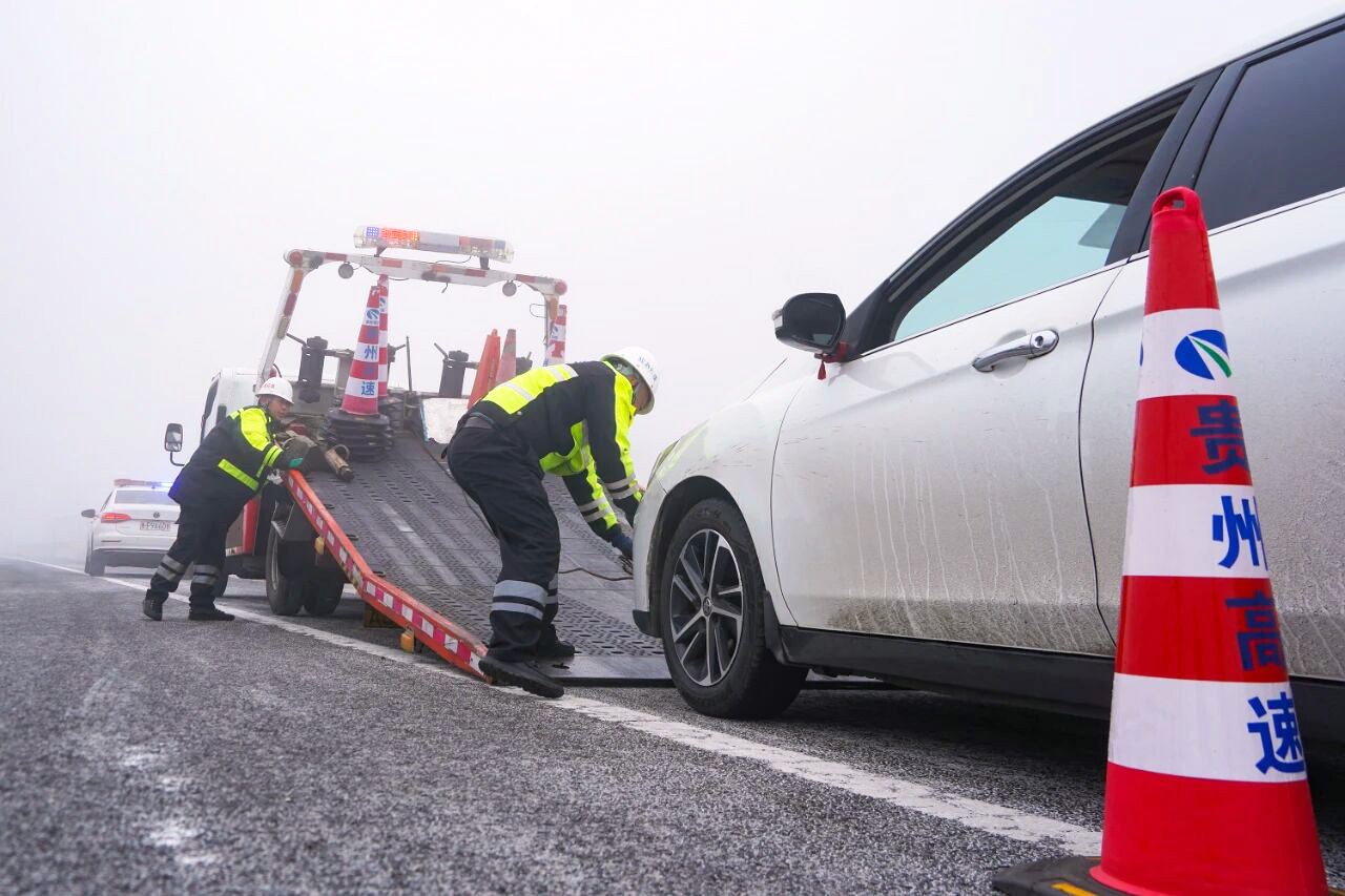 道路交通管制后,贵州高速公路集团有限公司毕节营运管理中心第六片区中心对故障车辆进行清障救援处置,同时联合贵州威围高速公路发展有限公司配合养护部门进行撒融雪剂除冰作业,在油污区域用木屑吸附油污,阻止扩散流入排水沟、农田或水源地,避免环境污染。