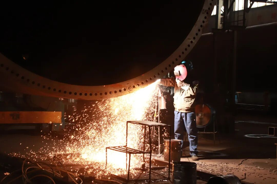 在贵州保龙设备制造有限公司忙碌的生产线上,工人们正在对风力发电塔筒进行碳刨处理,他们一手拿着防护面罩,一手平稳操控焊机,火星四射间抢赶订单进度。