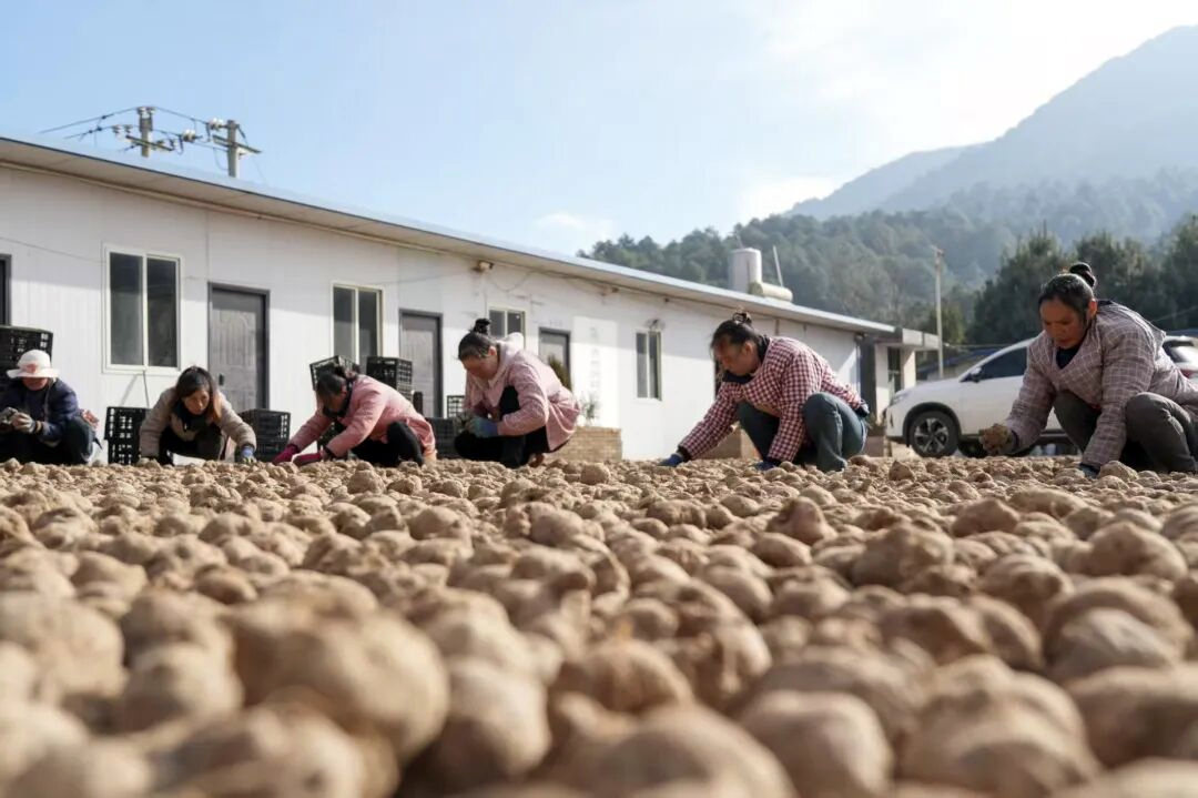 在位于麻乍镇松木坎村的贵州威宁鼎诚魔芋科技有限公司魔芋种植基地,一个个硕大饱满的魔芋随着务工群众的锄头破土而出,田垄上铺满了魔芋。刚采收的魔芋种子在晾晒场被整齐摊开,工人们一边翻晒一边谈笑,处处洋溢着产业兴旺的喜人景象。